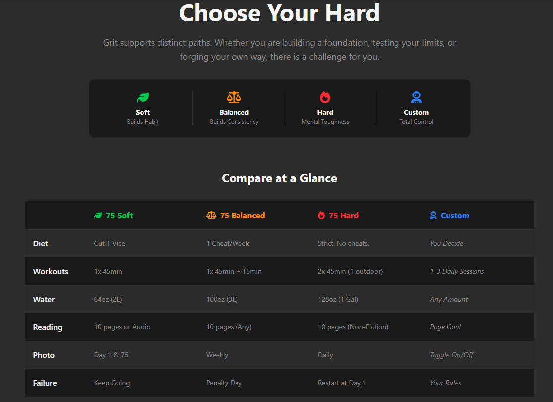 The biggest change in Grit 2.0 is inclusivity. We realized that "mental toughness" looks different for everyone. If 75 Hard feels like too much right now, that's okay. We’ve added three new ways to challenge yourself: